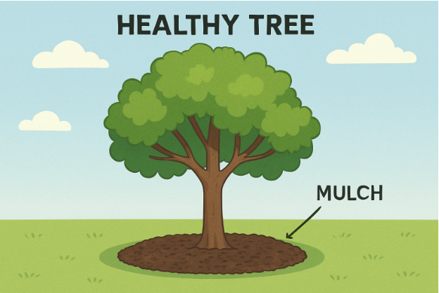 • Mulch Maintenance: Maintain a 2–4-inch mulch blanket to conserve moisture and control temperature, but avoid piling it against the trunk.
